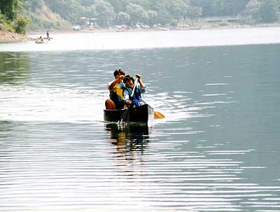 オールドタウンにキャンプ道具満載でカヌーでしか行けない対岸へ