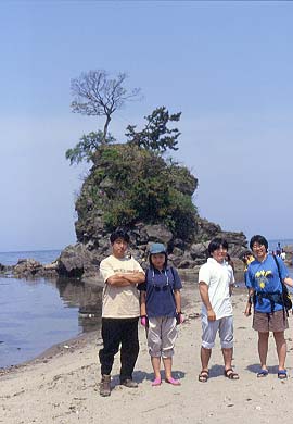 満潮になると沈んでしまいそうな細い砂浜を渡って小島へ