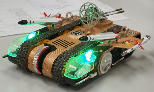 ![]() 毎度スーパーギミックで参加者の度肝を抜くどてやすさんの新作は ジャイロ誘導タンク。魚雷と同じ制御機構を有し、デコボコジオラマコースで コースを逸脱し始めても、自立制御で最初に設定したゴールに向かって 自動的に進路を修正する優れモノ!さてその実力や如何に?! |