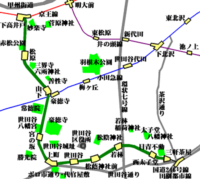 ■沿線の主な名所・旧跡 世田谷線沿線にある主な名所・旧跡を駅ごとに簡単に紹介しています。 ■世田谷線の見える店 窓の外には世田谷線・・・そんな、世田谷線を見ながらお茶が飲めたり食事が出来る、線路際の飲食店を紹介しています。 ■世田谷ボロ市 毎年1月15・16日、12月15・16日の4日間、世田谷駅と上町駅の間で世田谷ボロ市が開催されています。400年以上の歴史を有し、代官屋敷を中心に、ボロ市通りには古道具や骨董品、日用雑貨などの露天が所狭しと並び、毎年多くの人々で賑う、この沿線最大のイベントを紹介しています。 ■管理者のオススメスポット 沿線住民の管理者が独断と偏見で選んだ沿線のオススメスポットを紹介しています。 ■沿線のおみやげに・・・ 世田谷線での散策のお土産は・・・?沿線でしか買えない銘菓、名物などを紹介しています。 ■駅前ぶらり日記 各駅周辺を散策し、駅付近の様子や見所をレポートしました。 →世田谷線営業案内へ 世田谷線とは何か?といった基礎的な情報や、世田谷線散策に便利なお得な乗車券、電車時刻表などを掲載しています。 ・各駅マップ 世田谷線各駅のマップと簡単な駅周辺の紹介を掲載しています。 |