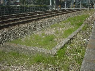 六所神社付近の線路沿いには、昭和29年に廃止された六所神社前駅上りホームのコンクリート土台が現在も残されています。