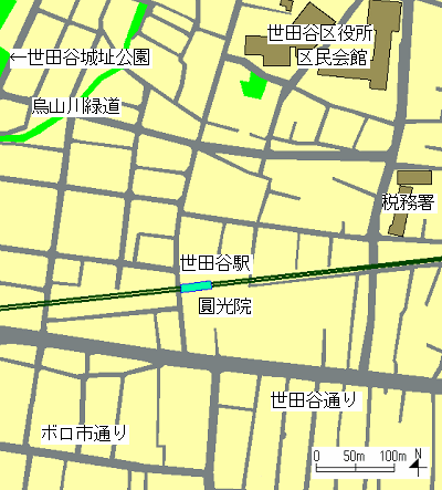 世田谷駅の裏に見える圓光院は、17世紀に創建された空海上人の作と伝えられる不動尊を本尊とする寺院です。創建から今日まで幾多の災害により本堂が倒壊したり、明治初めには廃寺になりかけるなど波乱万丈の歴史をたどってきています。明治12年にはこの地に桜小学校が開設され、上町へと移転したあと、現在は圓光院幼稚園が作られて、境内を園児の通学用のミニ汽車が走っており、参道には警報機や遮断機が付いた本格的な踏切が設置されています。