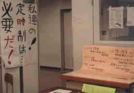 入り口にはテーマ、出口にはサブテーマを貼る事にしてそこまでは順調に行きましたが、文化祭の準備の時間が休日休みの関係でかなり削られて、準備が間に合わないのではないかとハラハラしました。東京や横浜など他の都市でも定時制問題をかかえている現状を知っていた私は、インターネットを使ったり、市民の会を利用して、各地の活動団体に連絡をとって資料を頂いたり購入したりしました。自宅にいるときや登校中、下校中には連絡をとり、学校では資料の整理をしたり、ほとんどの時間を使って文化祭に向けて準備をしました。資料が家に届くと資料を見て、学校に持って行き、登校中等に資料に目を通し、読みふけっていました。各地の現状が目に見えてきました。