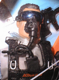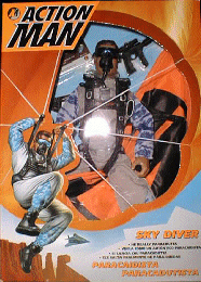 SKY DIVER このセットに付いてくるパラシュートは実際に人形に装備させて降下させることが可能です。こんな30cmもある人形を飛ばして遊ぼうなんて、さすがです。GIJOEシリーズでも97年秋にFAO限定で同様のパラシュートを含むGolden Knightが発売されましたが、ACTIONMANの方が先です。 |