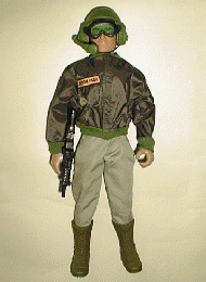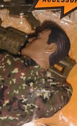 KNUCK このキャラもACTION MANの同志のようですが、イギリスでは売られていないようです。こちらは背中のレバーを押すと、パンチを繰り出すギミック付きです。写真のタンクトップはボディに書き込まれたものです。ズボンは布製ですが、かなりのマッチョマンなので他のユニフォームとの互換性は無さそうです。 |