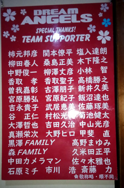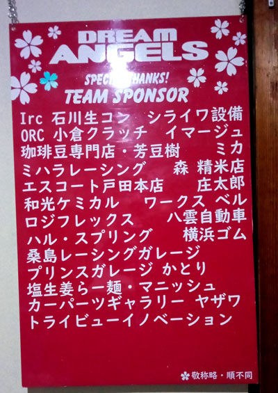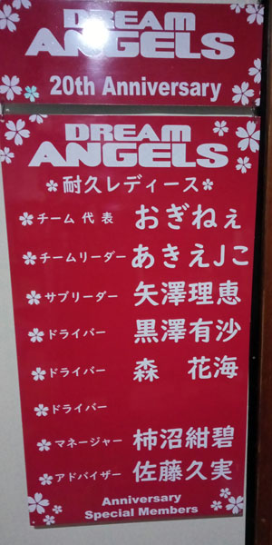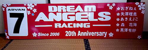 これは余談ですがかれこれ10年位VITAのブレーキパッドはずっとイマージュさんのを使用しています。その流れでカプチーノもイマージュさんにお願いして作って頂いているんですね、、、ただステッカーなんですがなぜか白色のステッカーが無いんですよ???シルバー、ゴールド、黒などなどなんです。 カプチーノに仕方なしにゴールドを貼っていたのですが目立たないままで。これまたS監督の自作で作ってみました。近くで見ると曲線などが荒いのですが、、、パッと目には分かりません(爆 と言う訳で白を貼ってみました!(要はヒマ人なんです) ・・・・・・・・・・・・・・・・・・・・・・・・・・・・・・・・・・・・・・・・・・・・・・・・・・ (03-17追記) ![]() 20周年記念バージョンですぅ 小松リーダーは卒業でJこさんに ![]() 今年はおぎねぇのドリーム・エンジェル・レーシング設立20周年なんですよぉ。思えば2006年の全日本スポーツカー耐久選手権レース(通称ルマン耐久)にRX-7のGT仕様で女性だけのドライバーチームで参戦しようと言う事になりおぎねぇが命名しチームを立ち上げました。 レースの格式が全日本選手権ですからルマンやGTチームのドライバーらがこぞって参戦し何時間も耐久レースで戦う訳ですから、そりゃ大変ですしドライバーも体力が必要です。 そんな中 チャッカリおぎねぇ達は表彰台に2度も乗っちゃったりしてしかも全日本選手権で表彰台初の女性ドライバーとかレースのランキングに名を連ねて年度末のJAF表彰式に呼んで頂いたりカッコ良かったです! それに味を占めてその後はRX-7S耐仕様を新たに製作して女性耐久レーシング・チームとして数年間参戦していました。 それからはしばらく休止状態でおぎねぇだけVITAで遊んでましたが。レース仲間が袖ヶ浦で軽8時間耐久レースを開催すると言う事になり、2023年に突如チーノ君を作り、ドリームエンジェル・レーシングを再結成し参戦した訳ですね。しかし、、、月日が流れるのは早いモノでふと気が付けばあれからもう20年もたっちゃった(大汗) 『今年で20周年を迎えたドリームエンジェル・レーシングはこれからも更なる高みを目指してチャレンジを続けていきます!』(おぎねぇ談)との事です。 そりゃぁS監督やおぎねぇも年取る訳ですが、年甲斐もなく未だにレースを楽しんでいます。まぁそんな訳で下げ看板やドライバーボードなど20周年記念にしてみました! ![]() 20周年記念バージョンのロゴを作ってみました! 記念ロゴ入りTシャツを勝手に作っちゃぉっと悪だくみを企んでいるS監督。要はただの暇な後期高齢者なんです。何んて言ってる場合じゃなくって。。。今週末は筑波でVITAの開幕戦でしかも120分耐久レースですから、ふざけてる場合じゃございません。準備しなきゃ! ・・・・・・・・・・・・・・・・・・・・・・・・・・・・・・・・・・・・・・・・・・・・・・・・・・ (03-27追記) 先日の筑波VITA120分耐久はユーチューブなどでご覧になった方も多いと思いますが、、、レースも半分位に差し掛かった所でスピン車両に巻き込まれクラッシュしてしまいました(涙 黒岩選手の気合の走りでクラッシュ直前までなんとトップを走っていただけに残念です!まぁ気を取り直してこっちの準備に取り掛からないと。。。でもVITAの方がカプチーノのレースより先に5月6日に富士で開幕戦が有るのでVITAの修理やテスト走行が先になってしまいます。 上手く時間を使って軽8耐の準備も並行して頑張っていますが、、、寄る年波には勝てなぁぁぁぁい! って感じです(汗 ![]() 今年仕様のボードです