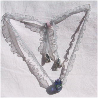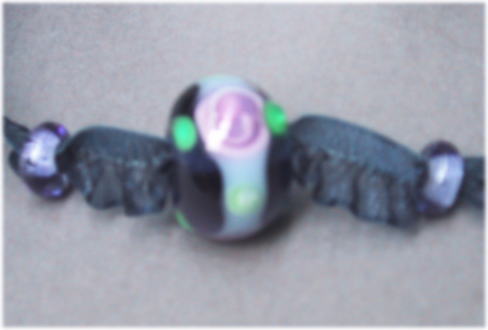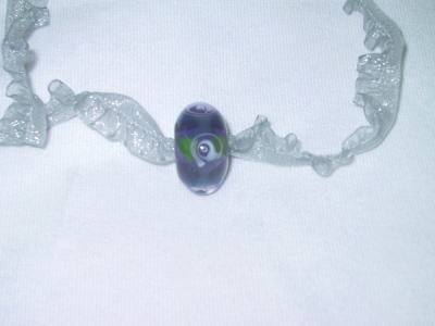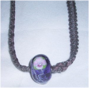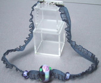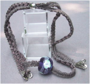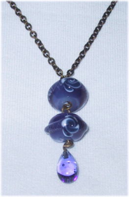 濃い紫のガラス地に渦を巻いた花をデザインしました。紐は薄いグレー透かしのフリルリボンで、胸元を女性らしく演出できます。長さの調節が可能なのでチョーカー的にも、また厚め洋服の上からでもペンダント的にもご利用になれます。長さは 最大60cmで、玉の大きさは20mm。 |