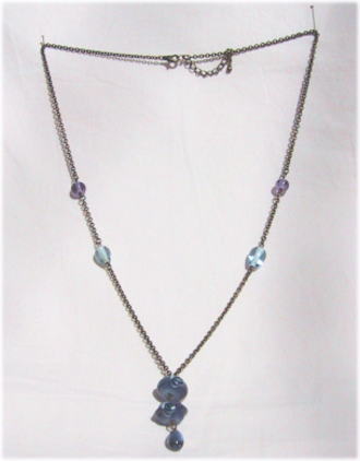 半透明のガラス地に藍色のガラスを被せた玉に花をおき、それを囲むようにレース棒がまいてあるデザインです。小ぶりの玉を2つ並べてしずく型のビーズでまとめました。金古美チェーンを仕様。全体的にシックな感じで、落ち着いています。長さは62cmで5cmほどの長さ調節が可能です。 |