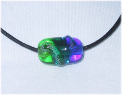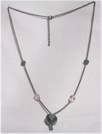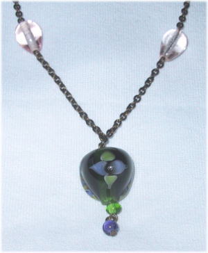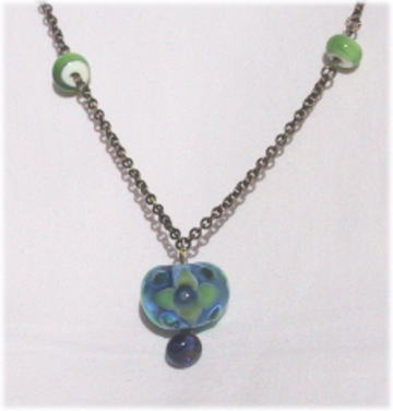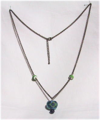 渋い深緑の涙型に、青と深緑の十字のデザイン。真中は空気のポイントがあります。ビーズのサイドには渋さが同系のねじりガラス棒がデザインされています。金古美チェーンを仕様。全体的にシックな感じで、落ち着いています。長さは62cmで5cmほどの長さ調節可能。 |