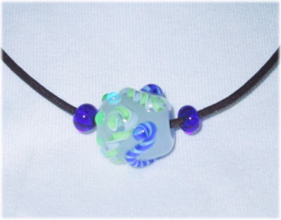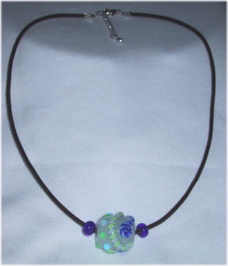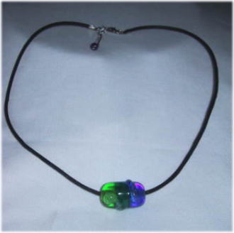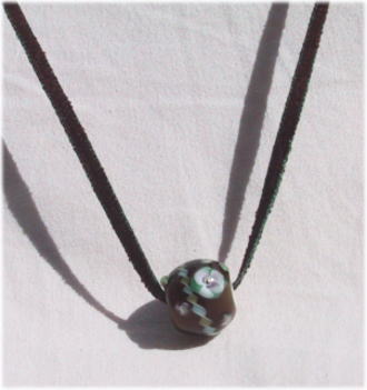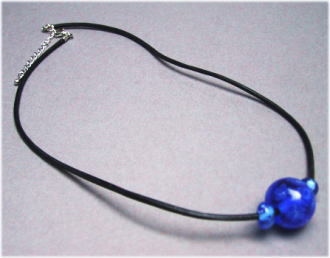 半透明のガラス地に鮮やかなブルーと黄緑のねじりガラス棒でデザインされた遊び心のある玉です。サイドに青色のガラスビーズをあしらっています。こげ茶2mmの革紐を仕様。長さは43cmで5cmほどの長さ調節が可能。 |
