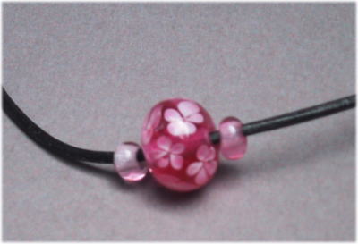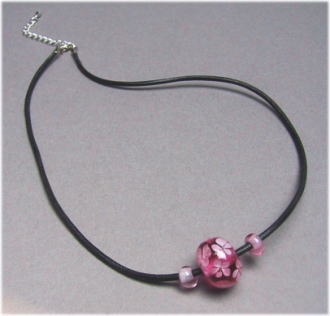 透き通ったピンク地のガラスに5枚の花びらを持つピンク花をいっぱいあしらったデザインです。サイドに同色ガラスビーズをつけてボリュームをだしています。長さは43cmで5cmほどの長さ調節が可能です。2mm黒革紐。 |
