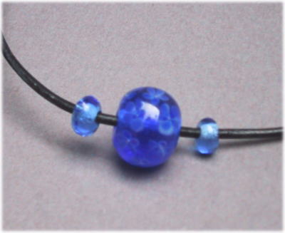 透き通った青色ガラス地に同色の青色の5枚花びらを持つ花をいっぱいあしらったデザインです。サイドに同色のガラスビーズを並べ、ボリューム感をだしています。長さは43cmで5cmほどの長さ調節が可能です。2mm黒革紐。 |