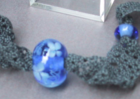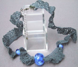深い藍色の地にバラをイメージした花をデザインしました。同じ藍色の透かしのフリルレースにトンボ玉を通しました。長さ36cmで5cmほどの長さ調節が可能です。 |