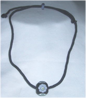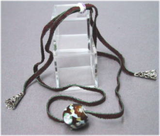 白地に茶透明のガラスを被せた玉に淡いピンクの花と、水色と淡茶のねじり棒、つぼみを散らしたデザインです。こげ茶色にサイドがグリーンのふちのあるリボンで、長さ調節はかなり可能です。夏は短く、冬はセーターの上からでもアクセントとしてご利用になれます。長さは74cmで、玉の大きさは直径17mm。 |
