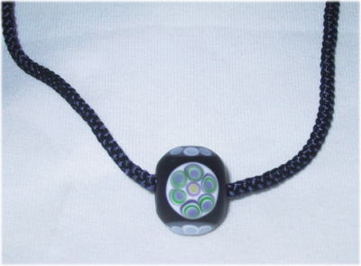 黒にちかい濃い紫のガラス地に戦国玉模様です。ガラスはマット(つや消し)にしあがってます。紐は紺色の組みひもを仕様。長さの調節は自由です。長さは最大66cm。 |