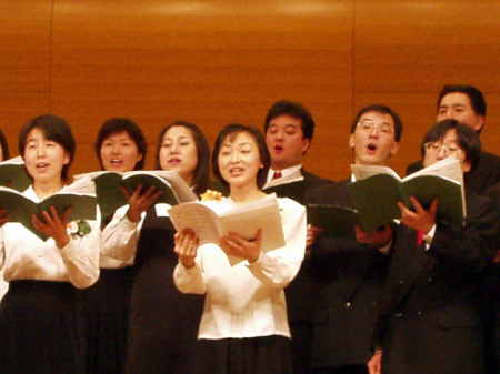![]() 演奏は最高潮へ。 40数名の歌声は、ホールを満たす。 |
