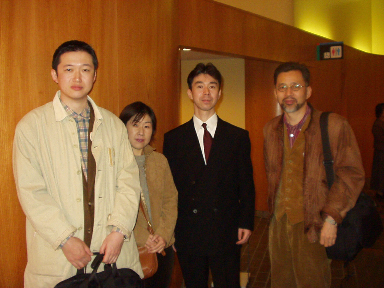 T氏夫妻、 Y氏もかけつけ、演奏を終えたTI氏とロビーで記念撮影。 「背筋が落ちたから、昔より声量はないですよ」と、上気した顔のTI氏。十分大きな声だったと思うけど。 この後、N社の元同僚と思しき男女に囲まれ談笑するTI氏であった。 |