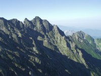 | 約30分の登攀を経て、9時には奥穂山頂に至る。 3190m、本邦第三位の頂上からは岳沢から上高地のホテル赤屋根までクッキリ見えた。 南には、焼岳、その向うに乗鞍、御岳も見える。 東は富士や南アルプスも遠望され、西にはジャンダルムご聳える。 頂上で、ニュージーランドから来たという女学生風の人と友人で日本(三重県)に住むという外国人女性。そして2人のガイドの女性とおしゃべりをした。 9時20分、頂上のケルンの最高部にある穂田神社のミ二社に一瞥をくれたあと、東に聳える前穂への吊尾根の縦走にかかる。 先行したNZの学生の3人組みを長い鎖場の下りの手前で抜いたが、あの足取りで本日中に上高地まで下山できるのかと他人事ながら不安を覚えた。 鎖の下降を手助けすべきか迷ったが、結局下で見守ることしかできそうにないし、こちらも今日の歩く予定があるので、どしどし一人で尾根を下る。 誰も追っかけて来ないと思って、一休みしていると異様なハイペースで近づいてくるクライマーが一人。 見る間に近づき道を譲ると、こちらがペースを少し上げてもあっという間に引き離された。 短ズボンの下には黒く日焼けした逞しい足が覘き羨望を覚える。 山で鍛え上げたベテランであろう。 |