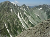 前穂へのつり尾根の南側の斜面を段々下るが、中々難しいところもあり一筋縄ではない。 しかし、10:20分、紀美子平に到着。 歩いてきた方向を振り返ると奥穂、それに連なるジャンダルムから西穂高へのピークが聳え立つ。 ここから前穂頂上までは登り30分と地図にあり、まだ昼までにも大分あるので、前穂を目指すことにする。 登り始めると、これが岩場を直登する感じで、4本の手足を駆使しがんがん上るのだが、頂上はなかなか見えて来ない。 紀美子平の人影はどんどん小さくなる。 25分かけてようやく頂上に至る。 たっぷり300mは登っただろうか。 前穂の頂上は広くあちこちにケルンが積まれている。 眺めは圧倒的だった。 目下には、「氷壁」の舞台にもなった東壁が眞逆さまに落ちる。その向うはいわゆる北稜の2−6までのピークが連なりその向うに屏風の頭が見える。 その右には横尾の山荘も見える。 北には、涸沢を挟んで北穂から槍への稜線。 さらに西を向くと奥穂が圧倒的なマッスで聳え立つ。 誰もいない静かな山頂で感動にひたっていると、例の九州の三人組のうち、年配の人が一人「追い付きましたね。」と姿を見せた。 私は3人より一足先に穂高山荘を発ったのだが、若い2人は奥穂からジャンダルムに向い、それから取って返して追いかけてくる予定だという。 毎年、夏に槍、穂高に来るというこの人は柳川からきたという事しか知らないが、今回は天気が素晴らしいと感嘆されていた。 写真を取り合って一緒に紀美子平まで下りると12時前になっていた。 穂高山荘で仕入れた何とか寿司弁当を食べて、この柳川の翁と一緒に岳沢に向けて下りだす。 いきなり鎖場の下りを過ぎ、照り付ける太陽のもと、風もあまりなく一気に汗が噴出してくる。 水を補給するため立ち止まっていると柳川翁が軽い足取りで、先にくだり始めた。やはりベテランで体力があるのであろう、付いていくつもりがどんどん離される。 下りが不得手な自分はストックを使いながらゆるゆると下るためか直に翁は見えなくなってしまった。 この「重太郎新道」は、傾斜が急で足場もあまりよくない。 うっかり浮石を落とした時など、50m以上草むらをどんどん転がって、下の登山道まで落っこちた時にはヒヤリとした。 |