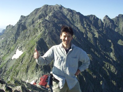 涸沢岳から奥穂、ジャンダルムを望む。下の赤い屋根は穂高山荘