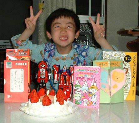 2003.06.02(月) 6歳 今回の戦利品 おばあちゃん⇒マシンロボレスキュー ジェット おじいちゃん⇒マシンロボレスキュー Kボーイ はる君⇒お手紙 渡辺先生⇒誕生日カード 父・母⇒本2冊 母⇒手作りケーキ なんかむかつく顔!