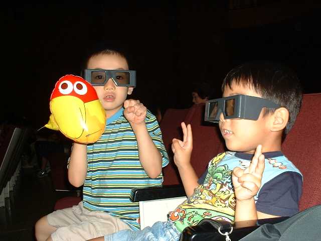 2003.08.21(木) キョロちゃん夢ファンタジーシアター 森永製品を買って集めたポイントで応募したキョロちゃん夢ファンタジーシアター いとこのはるくんと川崎市教育文化会館へ フルCG立体映像ムービーとキョロちゃんスペシャルショーと お菓子とパズルとキョロちゃんマスコットのプレゼントで2人とも大満足
