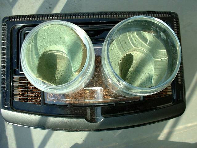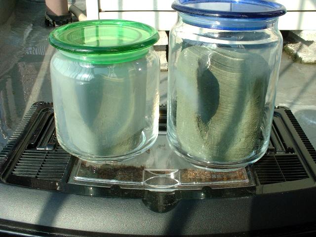 2006.3.16(木) 人工蛹室 1週間ごとの水遣り時に毎回表面の白カビ?をすくって ようやくおさまってきました 今回も変化が無いので人工蛹室を作ってみました 左がメス用、右がオス用です オアシスを加工し容器2ケで¥315 500mmのペットボトルも利用しようと思ってます 暖かくなってきたのでそろそろフン取りしてカブ君にお目にかかれるでしょう