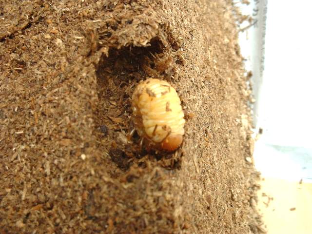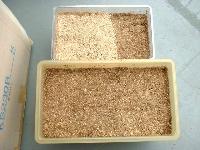 2006.4.27(木) マット追加 13日、20日と天候が悪く気温も低い為先延ばしにしていたフン取り 今日も雨で気温が低い 試しに小容器のかなぶん(?)の幼虫をひっくりかえしてみた。 まずい・・・ピクリとも動かない。 ソーっと元に戻し、大容器に4kg、中容器に2kgのマット追加のみとする 新品マットも結構色が違うのね 在庫マットはラスト1袋(2kg)になりました 5月にはサナギになるかもしれないので、今後は頻繁にチェックしないとね。