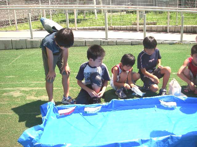 プールで進水式 「おー金子丸は一番早いなー!」と先生に誉められご満悦。
