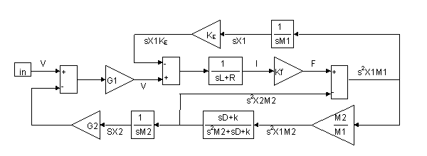 Kf=31.2 [N/A], Ke=35.5 [V/m/s], L=0.0023 [H], R=3.8 [Ω], M1=100 [Kg], M2=25 [Kg], k=5x108 [N/m], D=1.2x105 [N sec/m]
