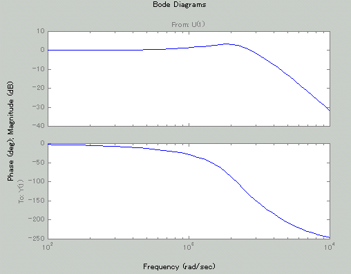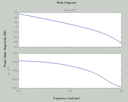 ボード線図の ゲイン−周波数 特性を調べると、約2000 [rad/sec] (=318[Hz]) あたりで、約3dB程度のピークを持ちます。これは、300Hz程度では、十分サーボの制御が可能であることを示しています。ただし、このモデルでは、空気のギャップ部分のばね定数をかなり大きくとって(高剛性のエアベアリング)、ゲインを高く設定できました。 市販のエアーベアリングでは、剛性は低い場合があり、ゲインも低く設定しなくてはならず、結果的に周波数特性が伸びないことが多いので注意してください。