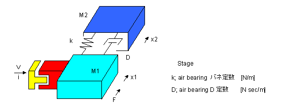 また、ステージ上にZ機構やθ機構が搭載された場合は、上記でのばね定数が、エアーベアリングのばね剛性だけでなく、付加された機構におけるばね定数も加味されなければならず、周波数応答もさらに劣化します。基本的には、剛体でない機構部品については、必ず加速方向におけるばね定数を計算して、運動方程式に加えてください。