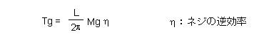 これと同様に、重力加速度による力 F=Mg をトルクに変換すると、トルク Tg は式B−4のようになります。ただし、このなかでは、ネジの逆効率を考慮して記入してあります。