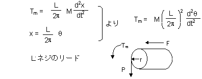 つぎに、負荷Mを加速させるトルク Tm について解説します。ネジのリードをL、半径をr、ネジの接線方向に働く力をPとする時、トルク Tm は Tm = Pr です。また、ネジのスラスト方向の力 F と Pの関係は比で表わすと、2πr : L = F : P となります。スラスト方向の力 Fは、質量M x 最大加速度となり、また、xとθの関係は、下に示した通りになるので、これらを総合すると、トルク Tm は式B−4のようになります。