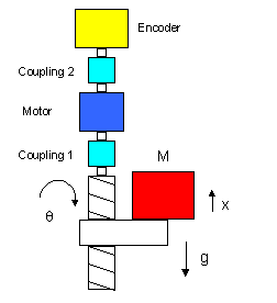 ここでは例題として、ネジを使って質量Mの負荷を上下に駆動させる機構を設計してみます。ネジには、モーターおよびエンコーダーが、それぞれカップリングを介して一直線上に連結されています。図B−aに簡単なモデルを描いてみます。図では表わしませんが、もちろん負荷Mはガイドレールに連結されていて上下方向に直線移動する機構です。また、ネジの回転量をθ、この時の負荷の移動量を x 、また、重力加速度をgとします。