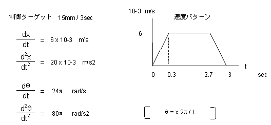 Ta, Tm を求めるには、最大加速度、最大角加速度を決める必要があります。目標として15mmのストロークを3秒で加減速駆動する場合について考えます。最高速度を 6 x 10-3 [m/s] とした時は、台形制御では、最高加速度は、20 x 10-3 [m/s2] で15mm移動できます。速度、加速度をそれぞれ角速度、角加速度に換算すると以下のようになります。(ただし、実際の制御では、加減速を台形制御で行うより、S字制御で行うことの方が多くなっています。ここでは、モータの選択のために簡易的に台形制御を例にとって説明しています。)
