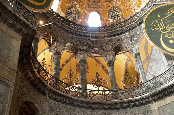 イスタンブール の旧市街。 ビザンチン時代にキリスト教会堂として建てられ、オスマン・トルコ時代にはモスクとなった世界的に有名な大聖堂 アヤソフィア のドームの吹き抜けの2階部分。 (ISO:1600, F6.7, 1/4sec, Av:+1.5, SR:on, Flash:off)