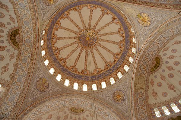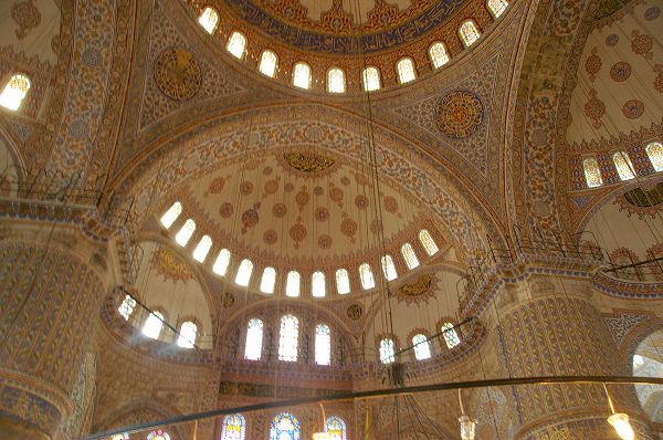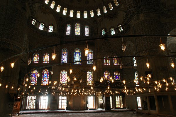 ブルー・モスク の大ドームの礼拝堂内部。 直径約50m。 イスラム教は、キリスト教と違って偶像崇拝ではないので、礼拝堂の中はなにもなくがらんとしています。 2mくらいの高さに多数のランプが円状に吊るされています。 (ISO:800, F5.6, 1/30sec, Av:+1.0, SR:on, Flash:off)
