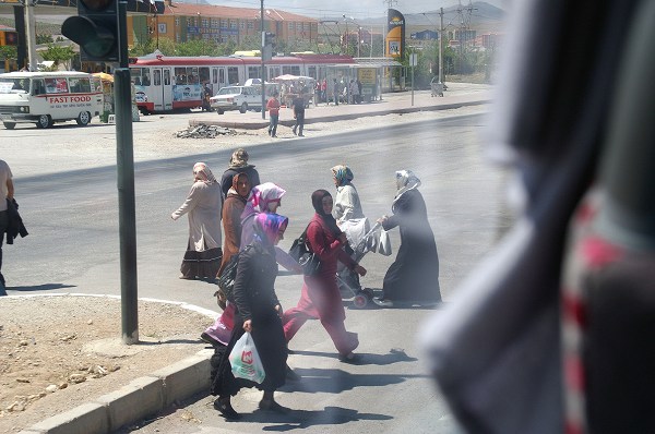 道路を横断中の、スカーフで髪を覆い、長袖に長スカートのイスラムの伝統を守った服装の女性たち。トルコの南部・コンヤの西方を移動中のバスの車窓から撮影。 (バスの窓ガラスに特殊なフイルターが貼り付けられていて、斜め方向はこのように見え難いです。ご容赦ください)