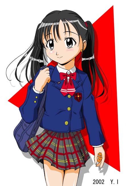 2002.11.?〜2002.12.1 約2ヶ月ぶりのイラストアップです。 制服のかわいい学生を描きたくてこうなりました♪一応、女子高生なのですが、中学生っぽいですね(^^;; チェックのスカートに初チャレンジだったのですが、まぁ、イメージ通りにはいったかな。もっと研究が必要ですが。 髪型も初チャレンジでして、おさげ髪というのでしょうか、これはいいですねぇ〜♪ 今回は黒髪でつぶれてしまいましたが、髪の流れとか考えてて楽しかったです♪ 制服は、別の色のバージョンも考えてて、違うバージョンとしで載せようかと思ってたのですが 今のところお蔵入りに・・・・(笑)