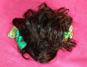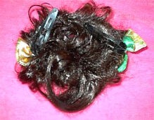 | 市販のカール付き針金のヘアピース(栗毛色)を丸く仕立て両サイドに 緑&金の帯生地りぼんとパッチン留めを付けました パッチン留めが二つ付いて居るのでどなたにも簡単に付ける事が出来ると思います あとは着物の色に合わせたお好みの髪飾りを付ければ立派なお姫様の出来上がりです (ベースが針金入りですので大きさや形もアレンジ出来ます) |