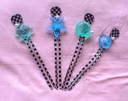 | ヘアスティック 各¥500 左より@サザエ Aヒトデ Bアコヤ Cヤドカリ型 長さ 約15.5cm |