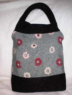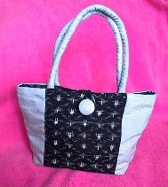 | リフォームバッグー 絣 ¥1500 サイズ:H22×W25cm 持ち手含H35 底18×12 ウール着物地を使ったトート 白と黒の絣のウール地と 黒色の木綿無地の組み合わせ |